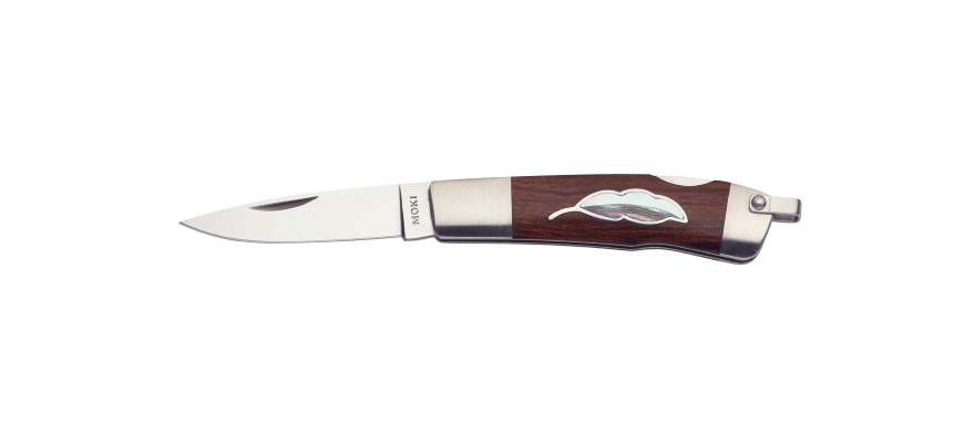 モキオリジナルリーフデザインを使用。紐を通せる実用的な環付。インドア・アウトドアにも汎用性の高いナイフ。